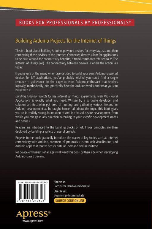 If you’re one of the many who have decided to build your own Arduino-powered devices for IoT applications, then Building Arduino Projects for the Internet of Things is exactly what you need. This book is your single resource–a guidebook for the eager-to-learn Arduino enthusiast–that teaches logically, methodically, and practically how the Arduino works and what you can build with it.