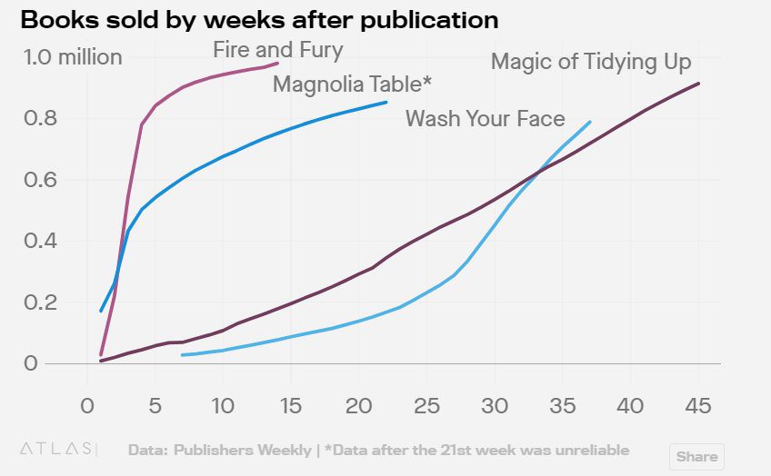 The convex curve for Hollis’ cumulative sales over time is also extremely unusual for a blockbuster. Most slow-starting phenomenons gain their steam steadily, including hits like Marie Kondo’s Life-Changing Magic of Tidying Up and Jordan Peterson’s 12 Rules for Life. Girl, Wash Your Face, meanwhile, but Girl, Wash Your Face’s accelerated growth is extreme.