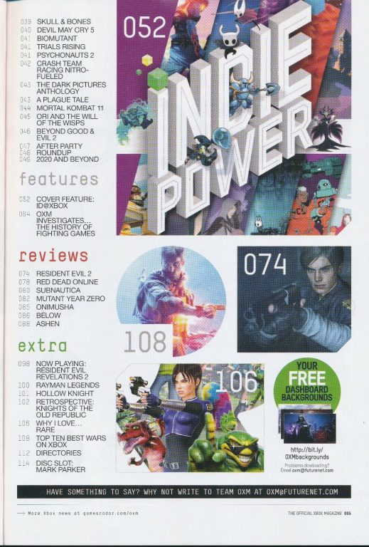 COVER FEATURE: ID@XBOX, OXM INVESTIGATES… THE HISTORY OF FIGHTING GAMES, RESIDENT EVIL 2, RED DEAD ONLINE, SUBNAUTICA, MUTANT YEAR ZERO, ONIMUSHA, NOW PLAYING: RESIDENT EVIL REVELATIONS 2…